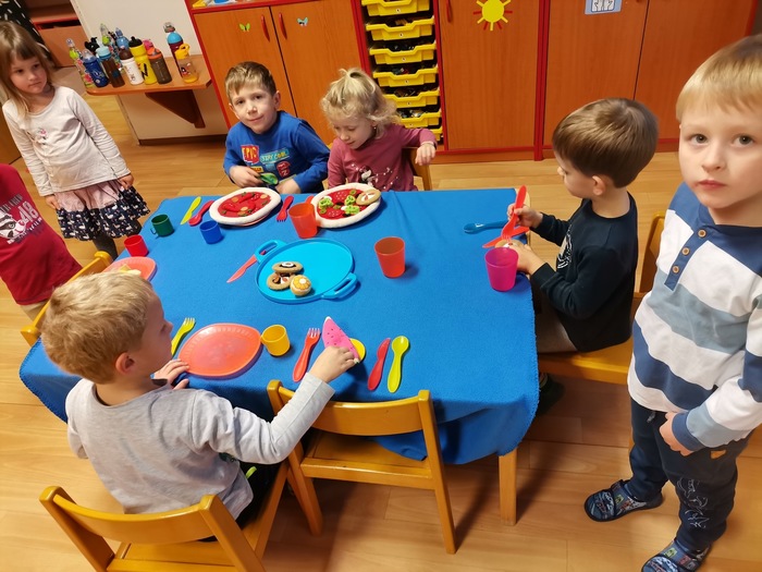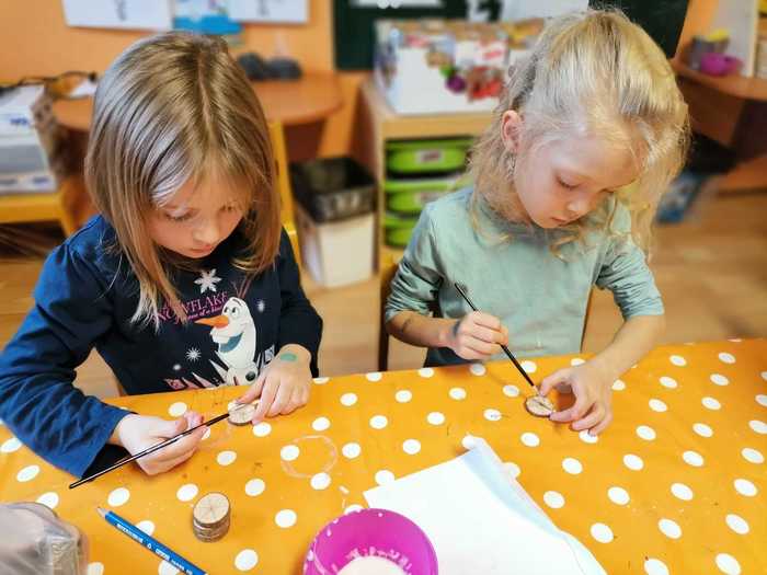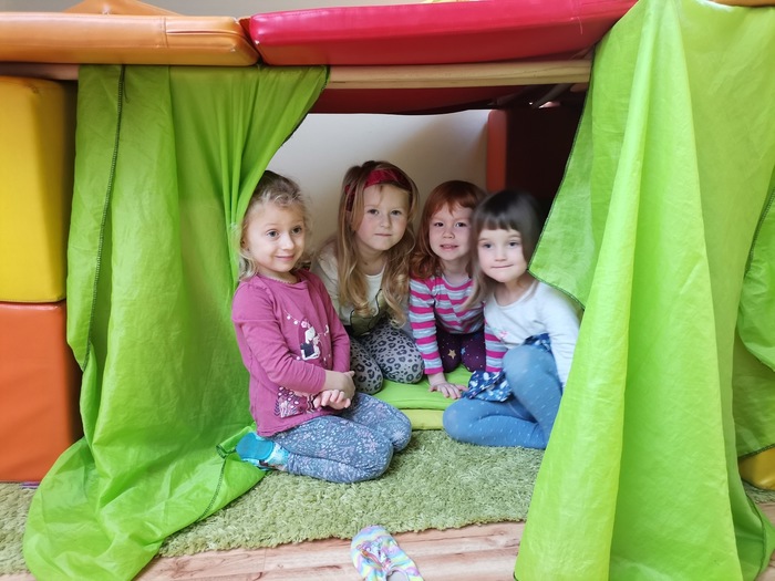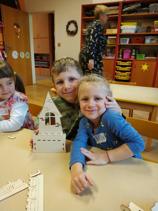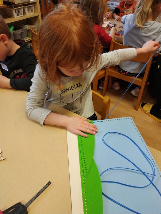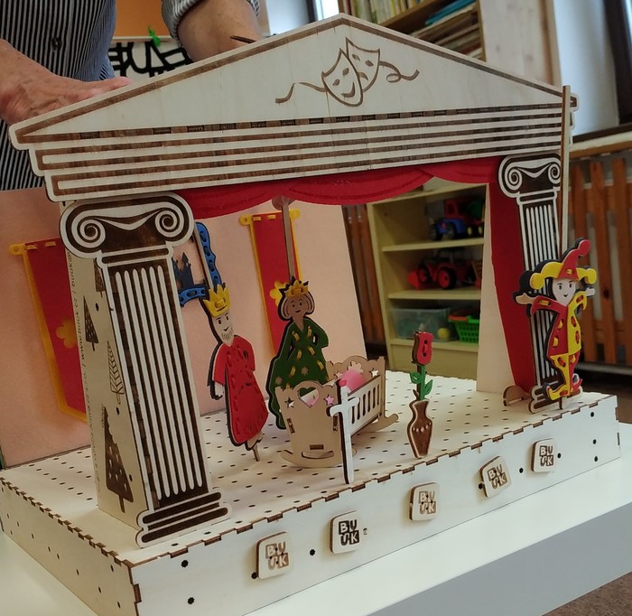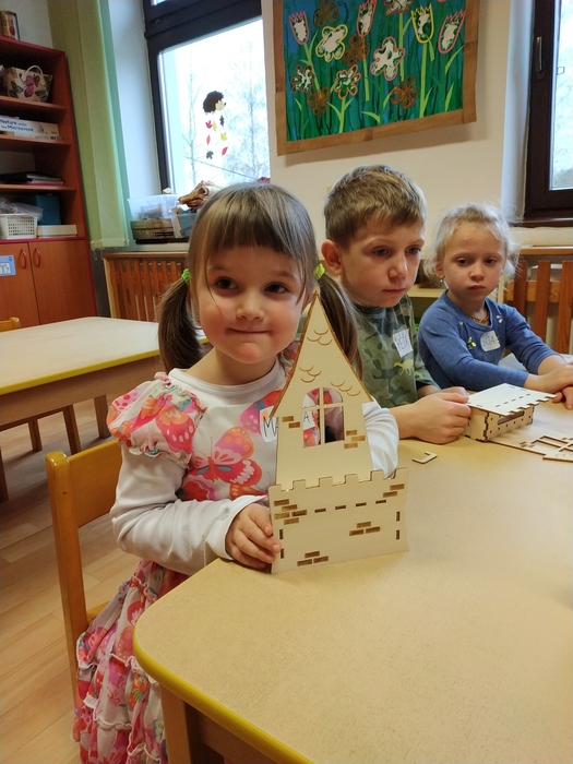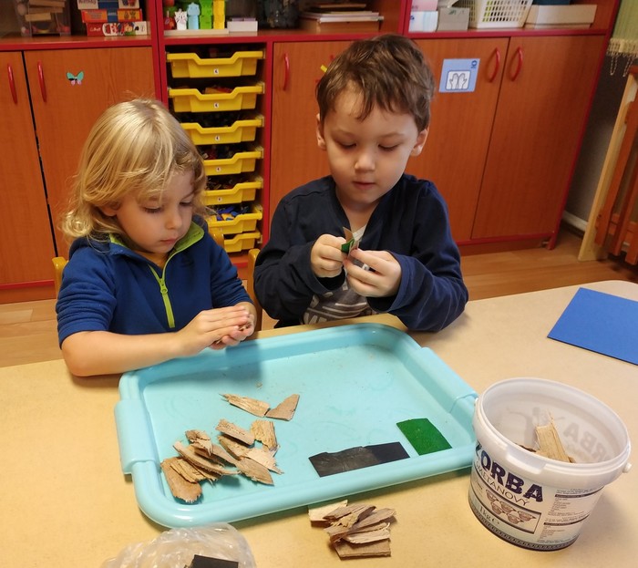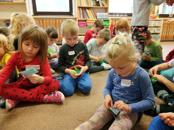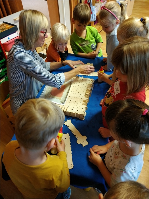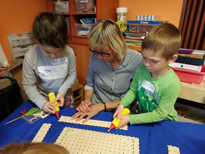 Během pohádkového týdne jsme zjistili, že děti velmi těší hrát divadlo s papírovými loutkami. Nejen že to děti zabaví, ale rozvinou si tak slovní zásobu, naučí se mluvit srozumitelně a nahlas, sestavovat správně věty a reagovat na řeč druhého. Přemýšleli jsme tedy, jak tuto aktivitu rozšířit. Naše volba padla na projektový den „Tvoření loutkového divadla z bukového dřeva“. Po nezbytném „papírování“ k nám zavítala pracovnice firmy, vyrábějící divadélko, Zdeňka a tvoření mohlo začít. Nejprve byly děti seznámeny s tím, kde se vlastně vzal materiál na výrobu divadla. Přiměřenou formou se dozvěděli o povoláních pracujících se dřevem, jak se dostane dřevo z lesa, na pilu a poté do truhlářské dílny. Následně byly děti rozděleny do třech skupin a byla vytvořena pracovní stanoviště, na kterých se skupiny vystřídaly. Na prvním stanovišti pod vedením Zdeničky děti opravdu sestavovaly a lepily celu konstrukci loutkového divadla, včetně opony. Na druhém stanovišti si zkoušely sestavit z jednotlivých dřevěných dílů kulisy do divadla a jednoduchým prošíváním dřevěné desky a filcu tvořily pozadí scény. Na posledním stanovišti už děti volně pracovaly podle své fantazie se dřevem, filcem, lepidlem, truhlářskými svorkami a tvořily si tak své výrobky, které si odnesly domů. Odměnou po celodopolední práci bylo pro děti loutkové představení pohádky „O šípkové Růžence“. Potom jsme se už se Zdeňkou rozloučili, ale celé divadélko nám samozřejmě zůstalo ve školce. Už se všechny děti moc těší, až budou svým kamarádům hrát pohádky.