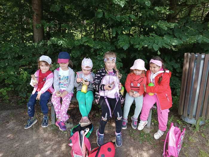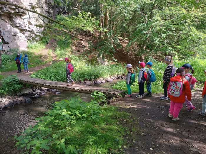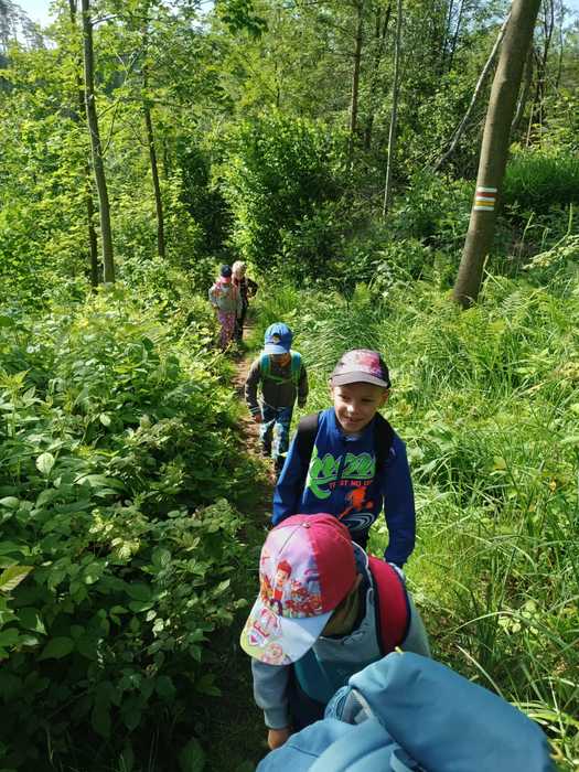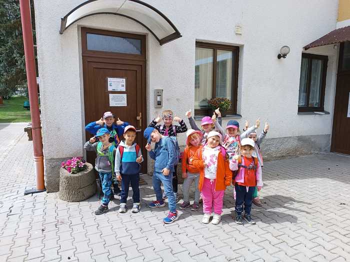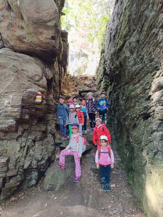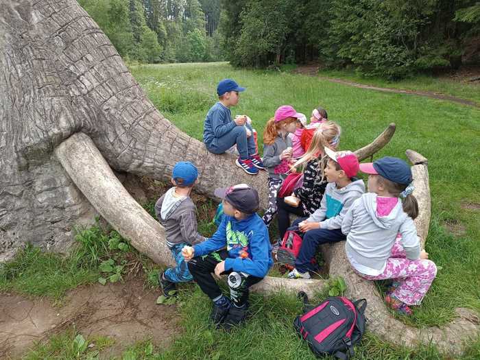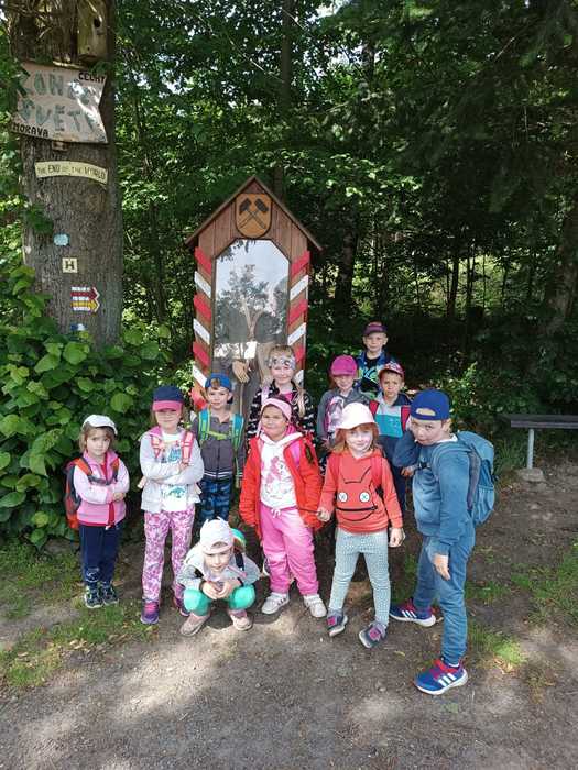 Léto je v plném proudu a k létu patří les, voda, rozkvetlé louky a pěší výlety se sluníčkem nad hlavou. A tak i my jsme se vydali na výlet, poznávat krásy naší Vysočiny. Z nádraží v Sázavě jsme se svezli vlakem do Hamrů a potom už jsme vyrazili lesní cestou plnou mechu a kořenů k soše mamuta. Na chvíli jsme se proměnili v pravěké lovce a každý si vylovil ze svého batůžku dobrou svačinu. Posilnění bylo důležité, protože nás, po krátkém focení u Šlakhamru, čekal výstup na Rozštípenou skálu. Na vrchol se odvážily téměř všechny děti a skvěle tu obtížnou cestu zvládly. Dále jsme se vydali do příkrého kopce podél skály a vystoupali jsme až k posledním domům v Hamrech. Děti, k překvapeních všech, objevily na jednom z domů velký obraz vodníka, bez fotky jsme ho nemohli minout. A to už byl v dohledu strážný ve své budce, který dlouhé roky hlídá „Konec světa“, historickou hranici Čech a Moravy. V nohou jsme měli velký kus cesty a tak všem přišla vhod vzpruha v podobě křupavé oplatky. Ještě jsme si prohlédli nádherné výhledy na sluncem pozlacené kopce, lesy a stráně a pak se vydali lesní cestou přes kopec Peperek zpátky do Sázavy a do školky. I když cesta byla dlouhá, všichni, i ti nejmenší, ji zvládli na výbornou jako správní turisté. Zůstaly nám krásné zážitky a společně jsme si slíbili, že hned po prázdninách vyrazíme na další turisťák!