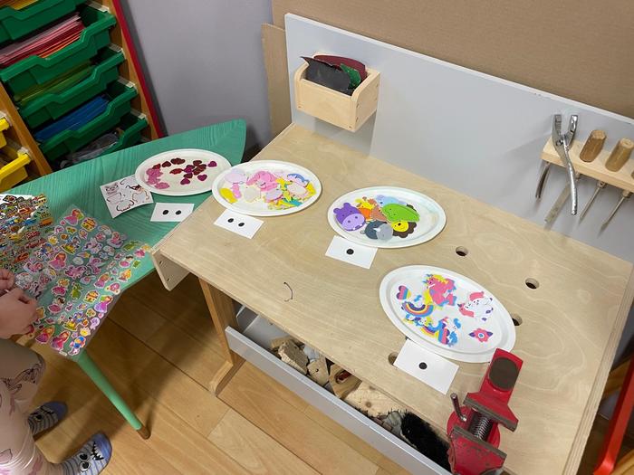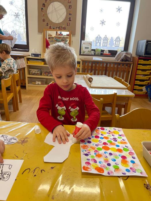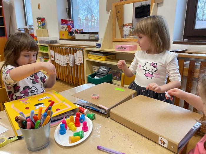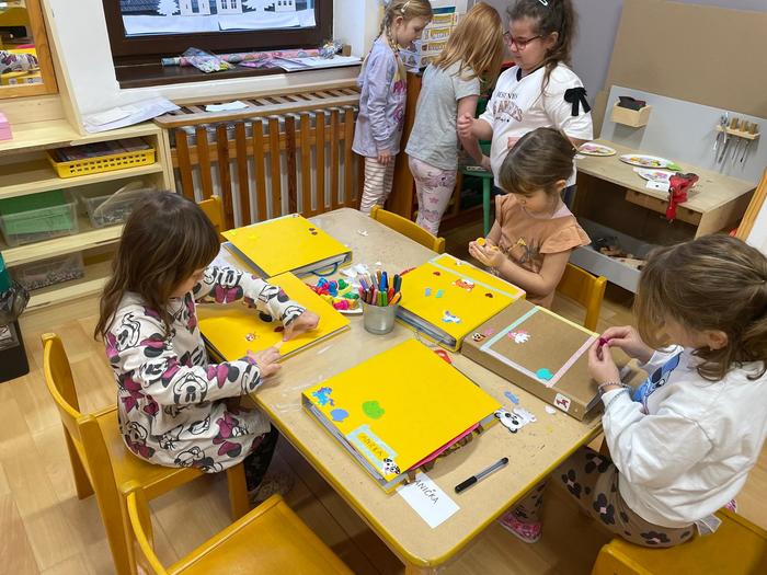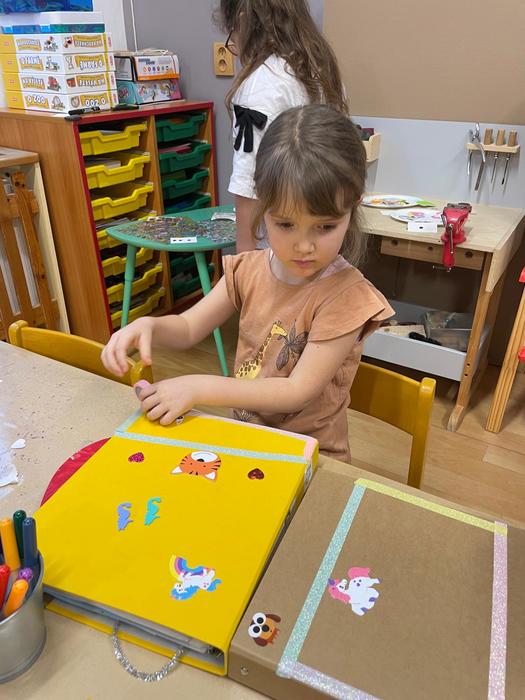 Zdobení portfólií - portfólio je složka, kam se dětem zakládají výtvarné práce, fotografie, písničky, básničky a spousta dalších informací za celou dobu jejich pobytu ve školce. Při odchodu do školy si je předškoláci odnášejí domů a mají krásnou památku na školku. Proto si je děti mohly vyzdobit podle své fantazie nejrůznějšími samolepkami, páskami a razítky.