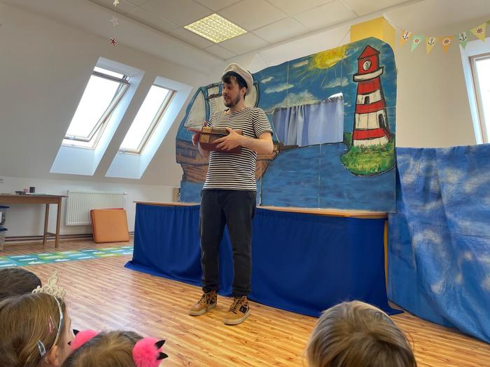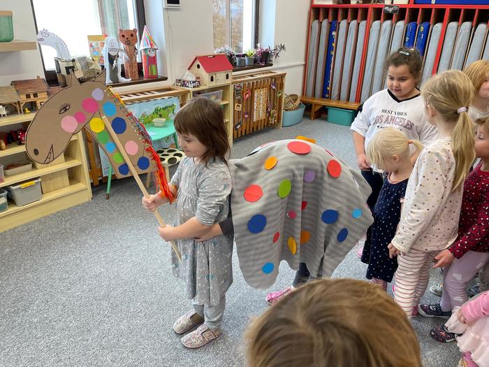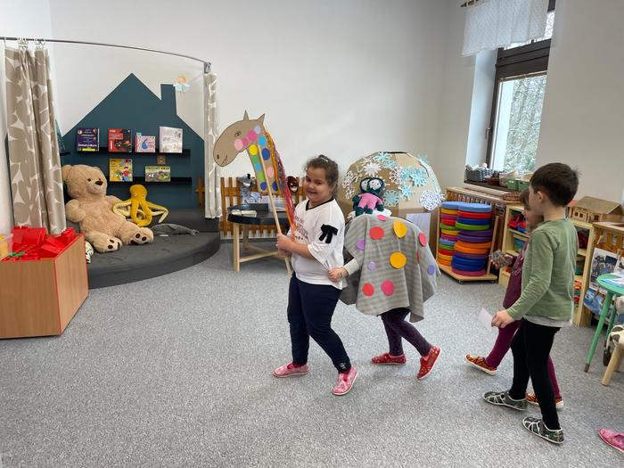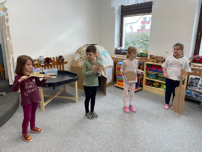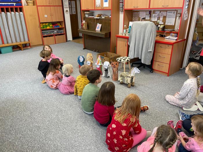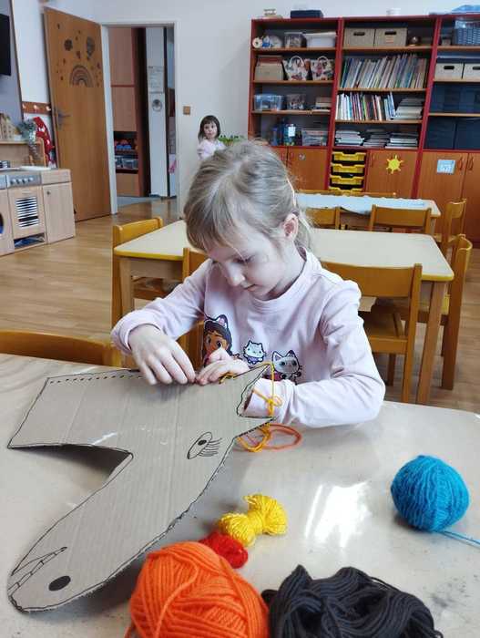 Příprava masky kobyly do masopustního průvodu - obkreslování šablony, stříhání koleček různých velikostí, předškoláci - vázání uzlů - koordinace ruky a oka, zpěv písničky "Já jsem muzikant" - rytmizace