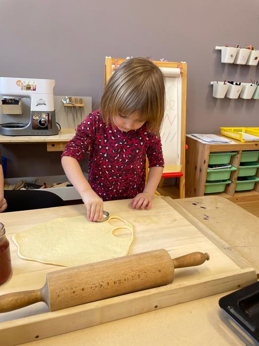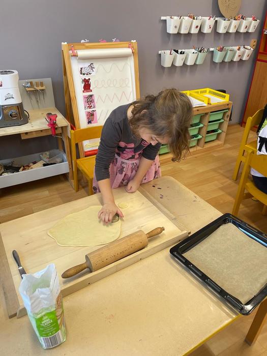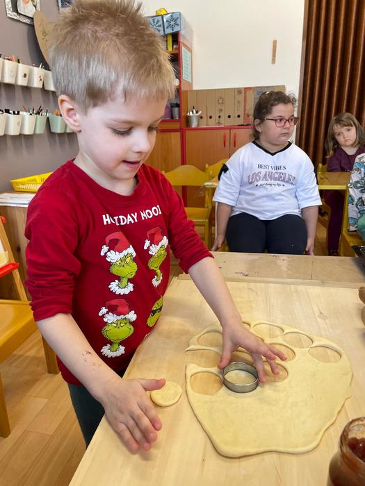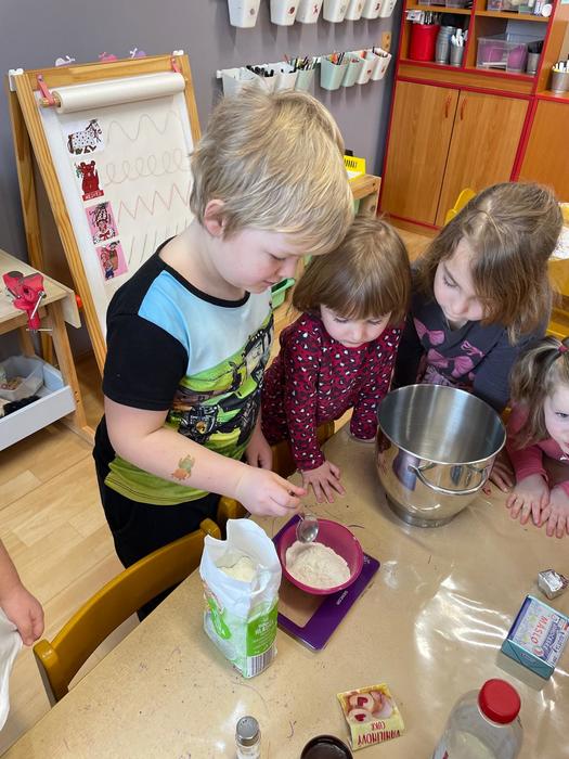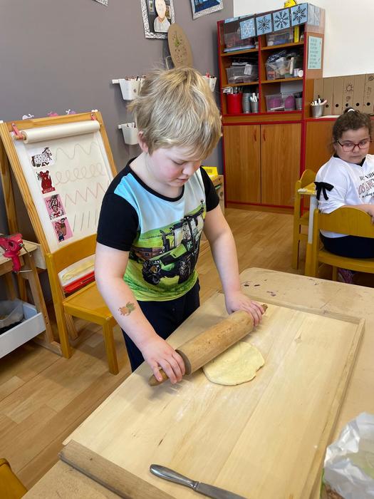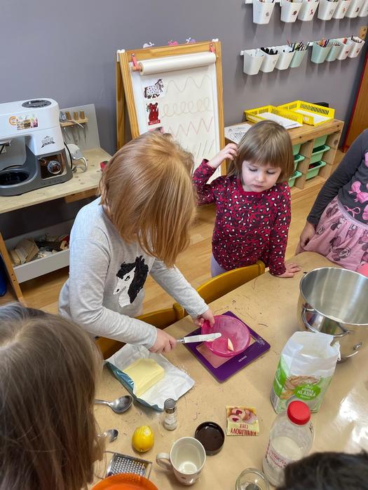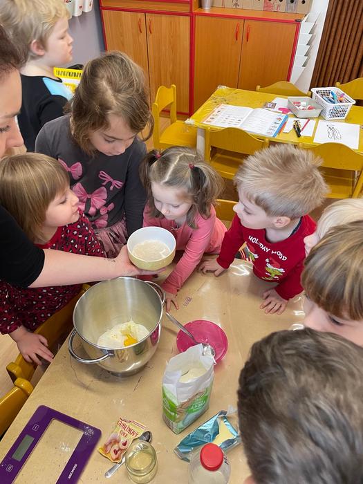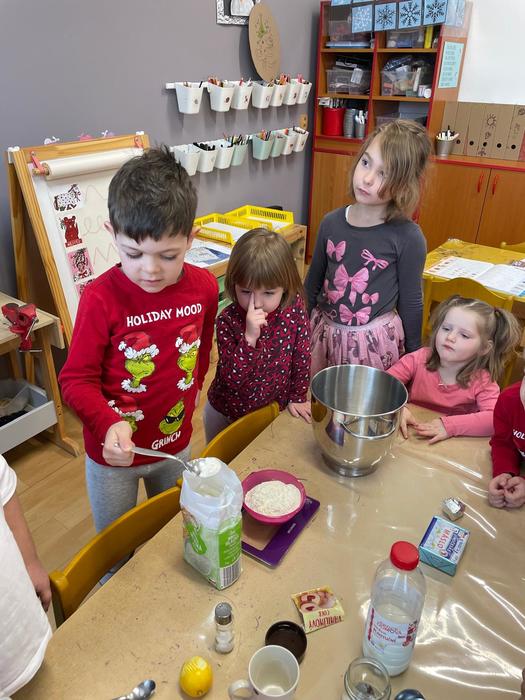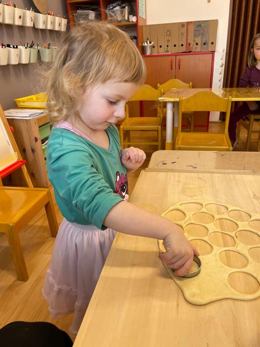 Pečení masopustních koblížků - pracovní úkony - příprava a odvážení surovin, kvásek - co to je a jak funguje, pozorování změn ve velikosti těsta, vyválení těsta, vykrajování koleček, plnění a samozřejmě ochutnávka.