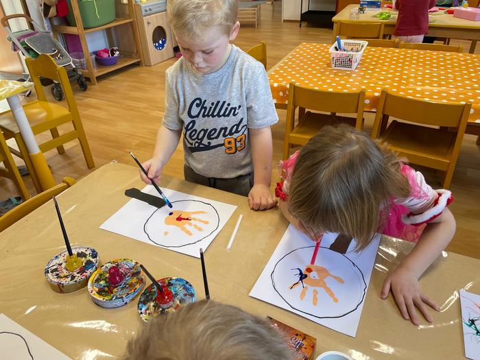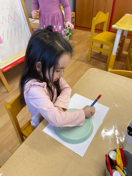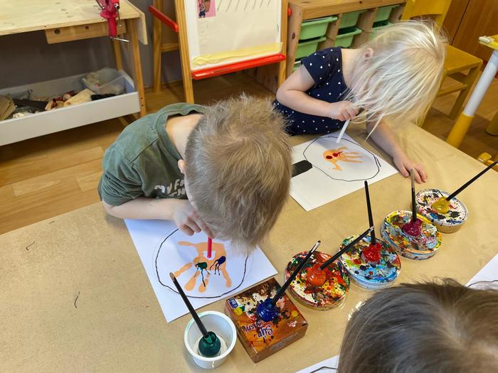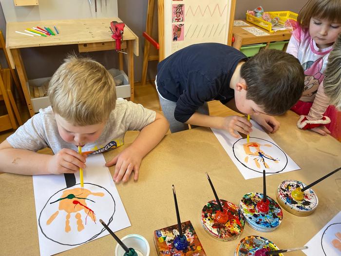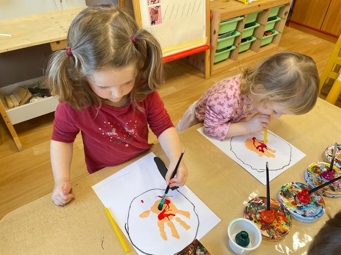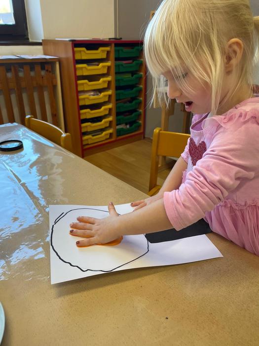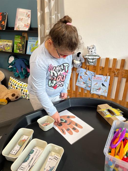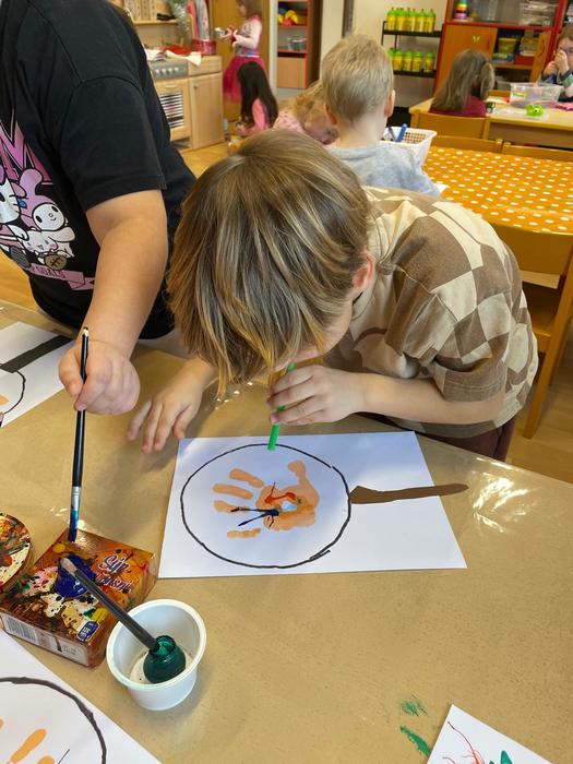 Bacily pod lupou - pracovní aktivity - obkreslování šablony, vystřihování jednoduchého tvaru z papíru, lepení, výtvarné aktivity - hra s barvou - obtisk ruky, rozfoukávání barevné skvrny, dechové cvičení