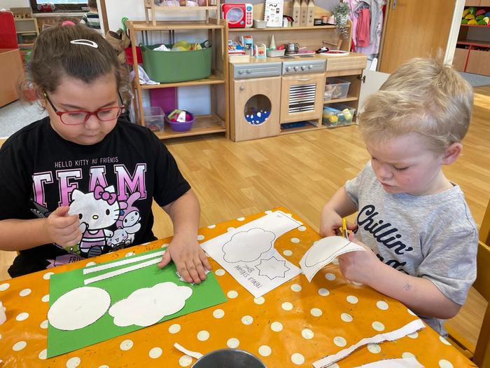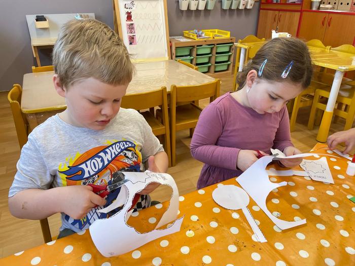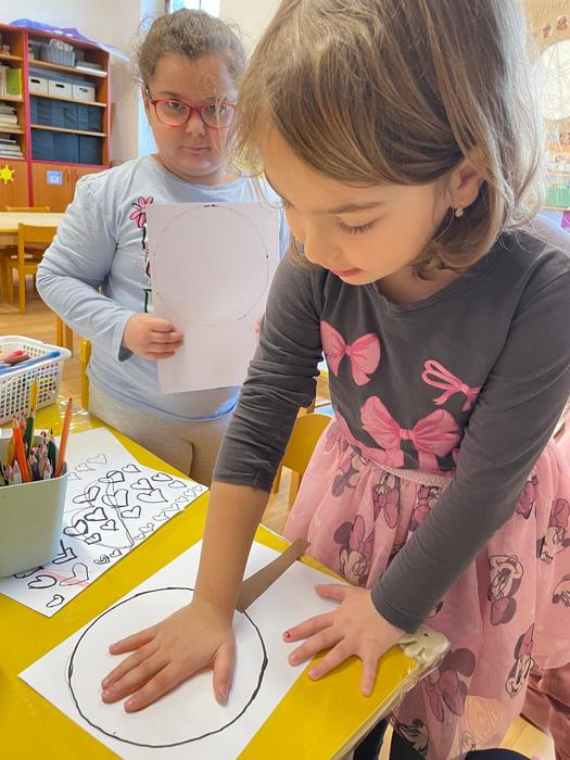 Trénování stříhání - manipulace s nůžkami, správný úchop, stříhání různých tvarů podle čar, rozmístění tvarů na papír - zaplnění plochy tak, aby se všechny obrázky vešly, lepení